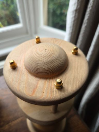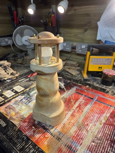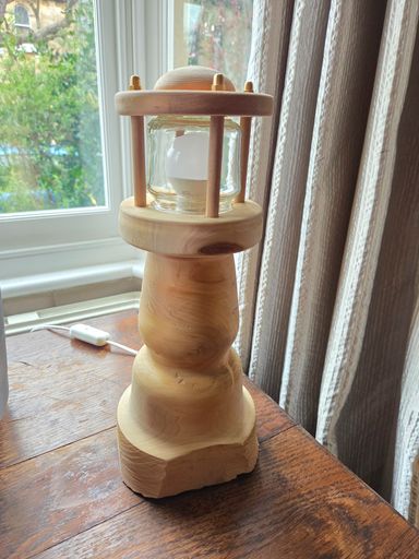 Unique, hand-turned lamp with plain wood finish in the form of a lighthouse. Takes small E14 bulb (included).